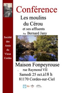 - 25 Octobre : faisant suite au thème de la visite du moulin de la Ferrière, une conférence sur « Les moulins du Cérou et ses affluents » vous est proposée par Bernard Jany à la Maison Fonpeyrouse (34 rue Raymond VII, 81170 Cordes-sur-Ciel) à 18h.