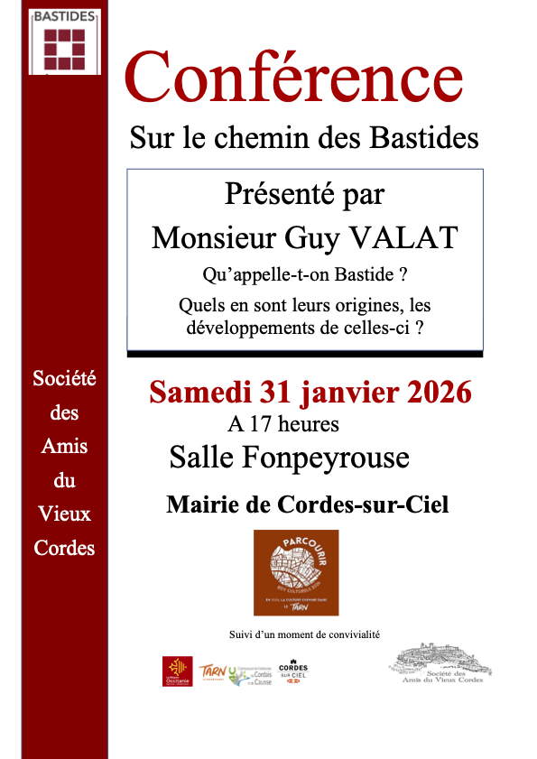 - 31 janvier : conférence « Sur le chemin des Bastides : Qu’appelle-t-on bastide ? Quels en sont leurs origines, les développements de celles-ci ? » présenté par Monsieur Guy VALAT à 17h en salle Fonpeyrouse (Mairie de Cordes-sur-Ciel).